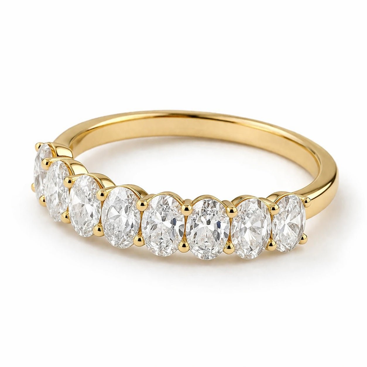 Elevate your jewellery collection with this stunning 18ct yellow gold band, a masterclass in modern luxury and ethical brilliance. Featuring nine meticulously matched oval-cut lab-grown diamonds with a total weight of 1.00ct, this ring is designed to create a seamless ribbon of light across the finger.