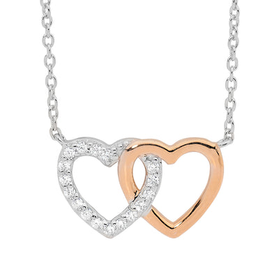 Sterling Silver Double Linked Heart Pendant with White Cubic Zirconia, Rose Gold Plating, and Attached Chain