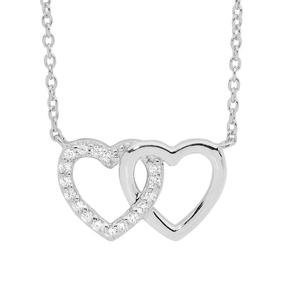 Sterling Silver Double Linked Heart Pendant with White Cubic Zirconia and Attached Chain