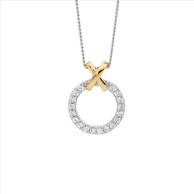 Sterling Silver 13mm Circle Pendant with White Cubic Zirconia and Gold Plated 'X'