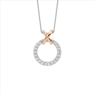 Sterling Silver 13mm Circle Pendant with White Cubic Zirconia and Rose Gold Plated X