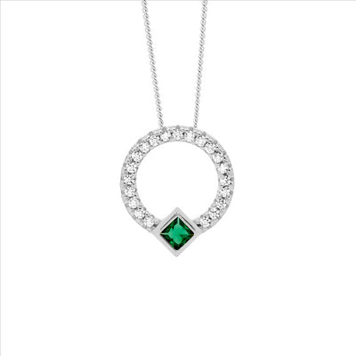 Sterling Silver Open Circle Pendant with Green Princess Cut & White Cubic Zirconia – Includes Chain