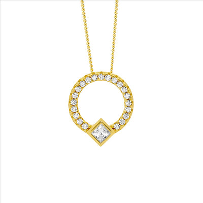 Sterling Silver 13mm Open Circle Pendant with White Cubic Zirconia, Princess Cut Bezel Set, and Gold Plating
