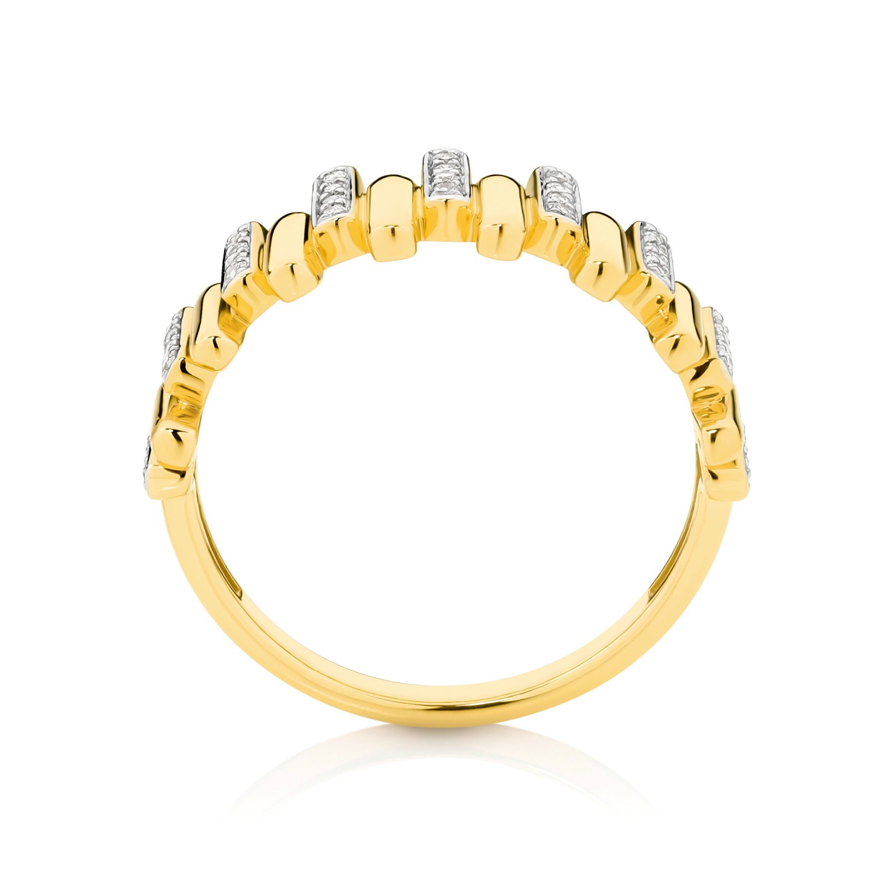 This stylish 9ct gold ring features a modern staggered lines design, set with sparkling diamonds totaling 0.14 carats. The diamonds, graded GH colour and SI clarity, add a subtle yet stunning sparkle to the sleek, contemporary band. Its unique pattern makes it perfect for anyone who loves clean lines with a touch of elegance. Whether worn alone or stacked with other rings, this piece offers versatile sophistication for everyday wear or special occasions. Crafted with quality and style, it’s an ideal addition to any jewellery collection, combining modern design with timeless sparkle.
